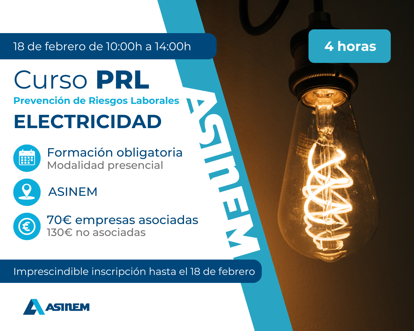 CURSO PRESENCIAL | El curso de Prevención de Riesgos Laborales (PRL) de 4 horas de electricidad se dirige a todo el personal trabajador que realice trabajos de instalaciones eléctricas en obras. Este curso es la formación obligatoria para acceder a obras en construcción. El horario de este curso es el día 18 de febrero de 10:00h a 14:00h.