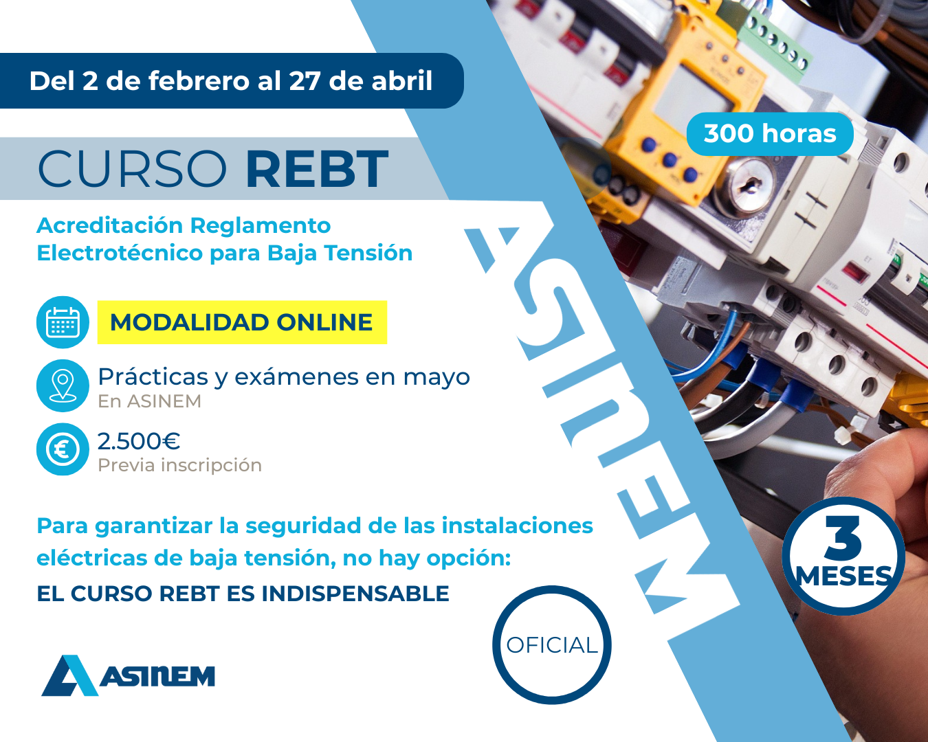 En ASINEM, la Asociación de Empresas Instaladoras de Baleares, ofrecemos el curso REBT (Reglamento de Electrotécnico para Instalaciones Eléctricas de Baja Tensión) en su modalidad online, del 2 de febrero al 27 de abril de 2026. Con este curso, obtendrás la titulación oficial de profesional instalador electricista de baja tensión, que habilita para realizar las tareas de diseño, instalación y mantenimiento de las instalaciones eléctricas de baja tensión.