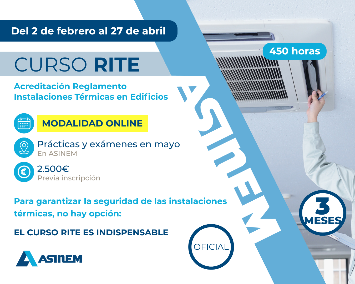 En ASINEM, la Asociación de Empresas Instaladoras de Baleares, ofrecemos el curso RITE (Reglamento de Instalaciones Térmicas en Edificios) en su modalidad online, del 2 de febrero al 27 de abril de 2026. Con este curso, obtendrás la titulación oficial de profesional instalador, que habilita para realizar las tareas de diseño, instalación y mantenimiento de las instalaciones térmicas que componen un edificio: climatización, calefacción y agua caliente sanitaria, así como las instalaciones de energía solar térmica.
