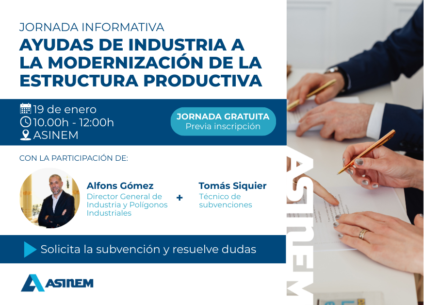 Este 19 de enero, de 10:00h a 12:00h, en ASINEM, realizamos una jornada junto a la Dirección General de Industria y Polígonos Industriales sobre la correcta tramitación de la subvención, con la participación de Alfons Gómez, Director General, y Tomás Siquier, técnico de subvenciones.