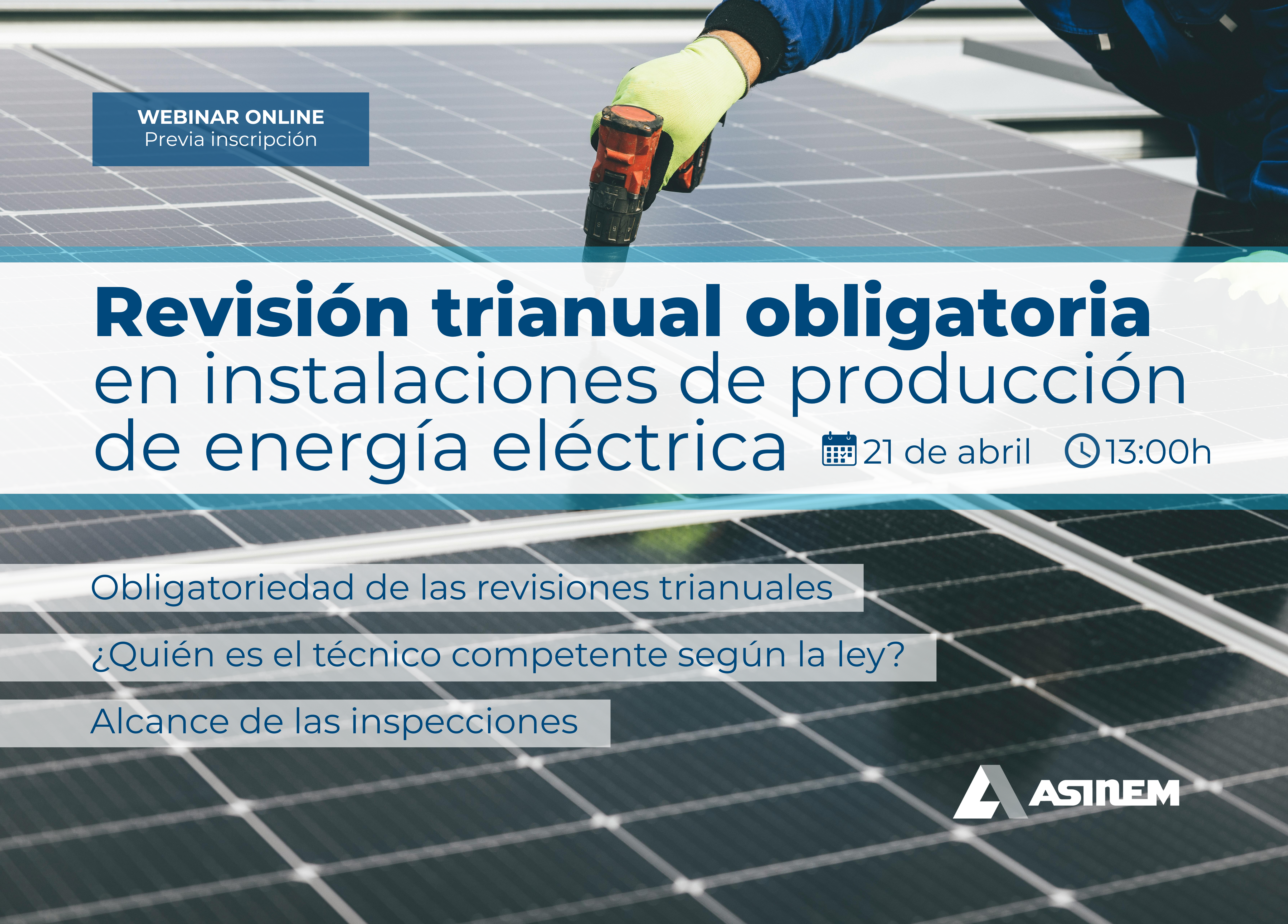 El martes día 21 de abril, ASINEM ofrece un WEBINAR INFORMATIVO sobre las revisiones trianuales obligatorias de las instalaciones de producción de energía eléctrica.