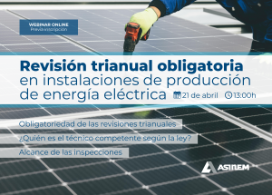 El martes día 21 de abril, ASINEM ofrece un WEBINAR INFORMATIVO sobre las revisiones trianuales obligatorias de las instalaciones de producción de energía eléctrica. Se recuerda a las empresas instaladoras la obligación legal de someter dichas instalaciones a inspecciones periódicas, en cumplimiento de lo dispuesto en el artículo 10.6 del Real Decreto 1699/2011, de 18 de noviembre. Las instalaciones de producción deben ser revisadas al menos cada tres años por técnicos titulados, libremente designados por el titular de la instalación. En la sesión se resolverán…